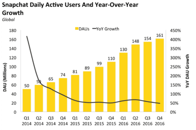 - Of those users, over 160 million are active daily. (Source: Snapchat's IPO paperwork)