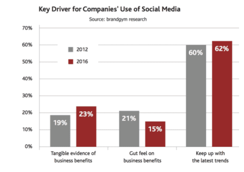 Shockingly, 62% of brands are only using social media because it makes them look like they're 'keeping up with the latest trends' rather than because of tangible evidence of the benefits to the business. This is according to surveys of over 100 marketing directors. Companies can't know the benefits of social unless they're measuring it properly, and it would be interesting to see how many of these businesses are properly attributing social traffic and how they measure it's success or otherwise. However, the evidence is clearly there that lots of businesses aren't seeing real benefits from social media. Marketing directors need to shit or get off the pot. Either build proper attribution models which can prove social's benefits (if they are there- for some businesses they won't be), or don't use it. Do or do not. There is no try.