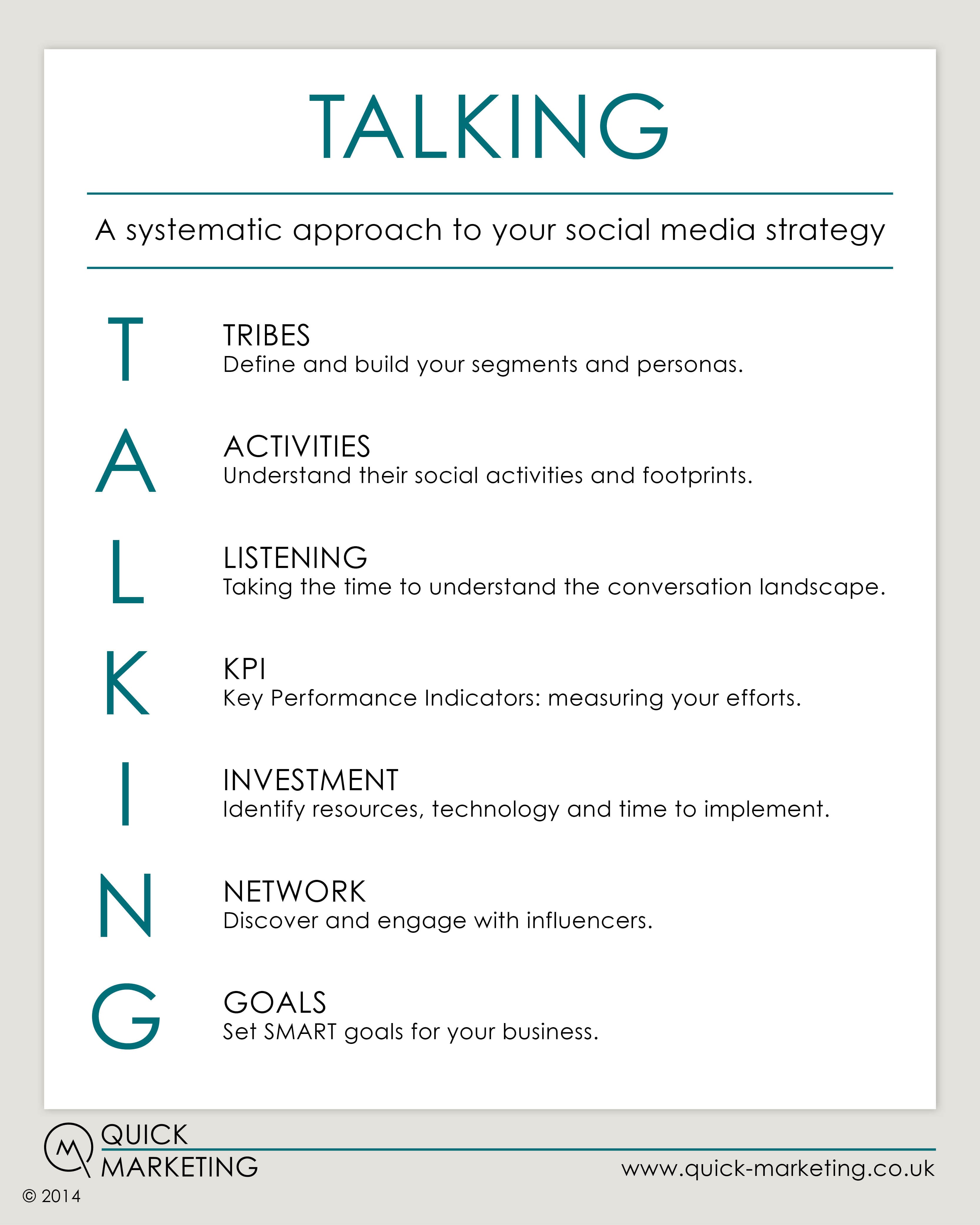 This inspired me to create my own acronym TALKING, a social media management framework to help shape and champion social media plans. I've used it with many different types of business since and it seems to give rise to good discussions around the main social media strategy and management issues.