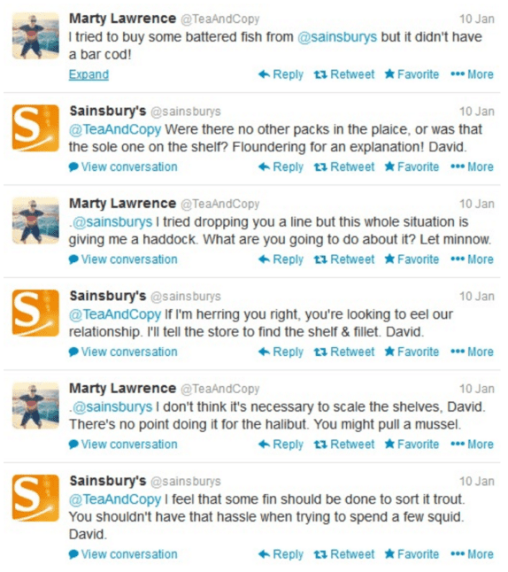 Sometimes customers Tweet the darndest things. Sainsbury’s is a Social Media King in the UK, and fished out a funny exchange from an errant Tweet about a cod. Talk about ‘knowing the customer.’ Sainsbury did a bit of research to know they were talking to self-described ‘pun enthusiast’ so they went in for the kill. They managed to come off human, engaging and even funny. This is the kind of brand sentiment that cannot be bought, it must be earned.