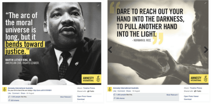 With a risk of the same images surfacing on the web telling multiple brand stories, the rise in stress-free design apps are becoming the go-to tool for the likes of Amnesty International who need striking and engaging graphic content to be produced in minutes. A quick skim of their Facebook page immediately displays a clear visual style. Having ownable and distinctive assets means audiences can identify your content within seconds.