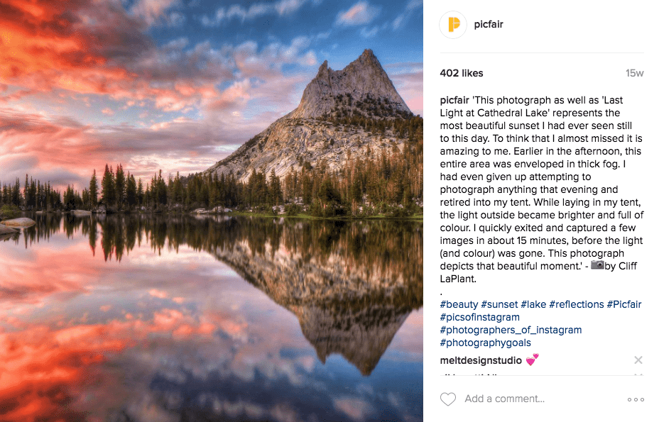 While Twitter imposes a 140-character limit, Instagram users revel in the ability to tell their stories more freely. Instagram limits caption length to 2200 characters; a perfect blank page waiting for a well-crafted story. Leading publishers like National Geographic and General Electric are mastering this tactic daily. The golden rule is to start with a strong opener; captions are cut off in the main feed after 140 characters, with users needing to click to ‘more’, so leave your secondary hashtags to the end. One of Picfair’s most highly engaged Instagram posts came from one of our photographer takeovers — a stunning photo accompanied by an equally absorbing first-person account to complete the story.