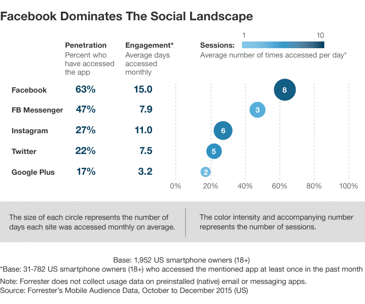 One of the most pertinent takeaways from the Forresters Report, is just how "addictive:" Facebook is. The chart breaks down the amount of touch points or "session" we have with the apps throughout the day. Facebook leads the way with on average 8 sessions, per day used. Followed by Instagram with 6 and Twitter with 5. This highlights the constant need for communication and content, we need everyday.