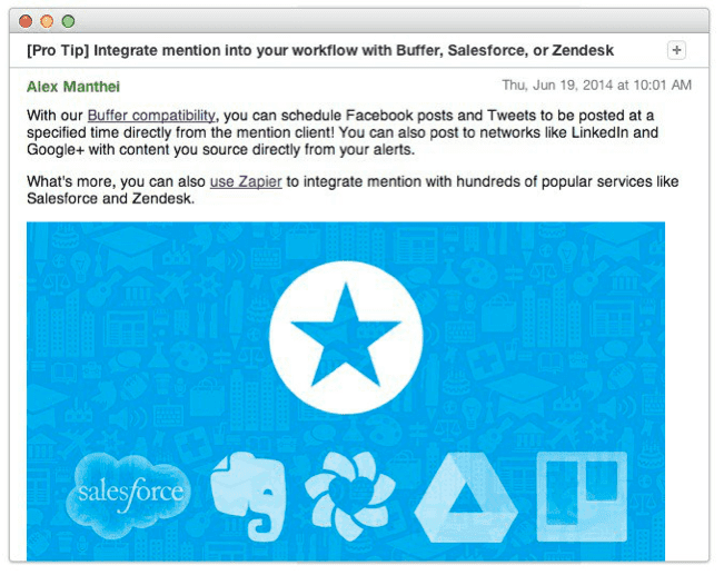 13. Increase your communication – Most businesses know that keeping in touch with customers is the best way to retain them. While this is true, many companies are simply not doing enough. Increasing your communication with users could help you reduce churn rate just like Mention did.In addition to sending out automated marketing emails to free trial users, the company encouraged feature activation. They sent out “Pro Tips” emails to paying customers like in the image below.