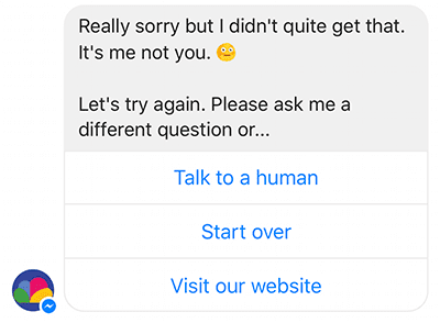 As chatbots are still in their infancy there are bound to be some technical issues. You can mitigate some of this risk by providing helpful ‘error’ messages with clear routes to speak to a human representative.