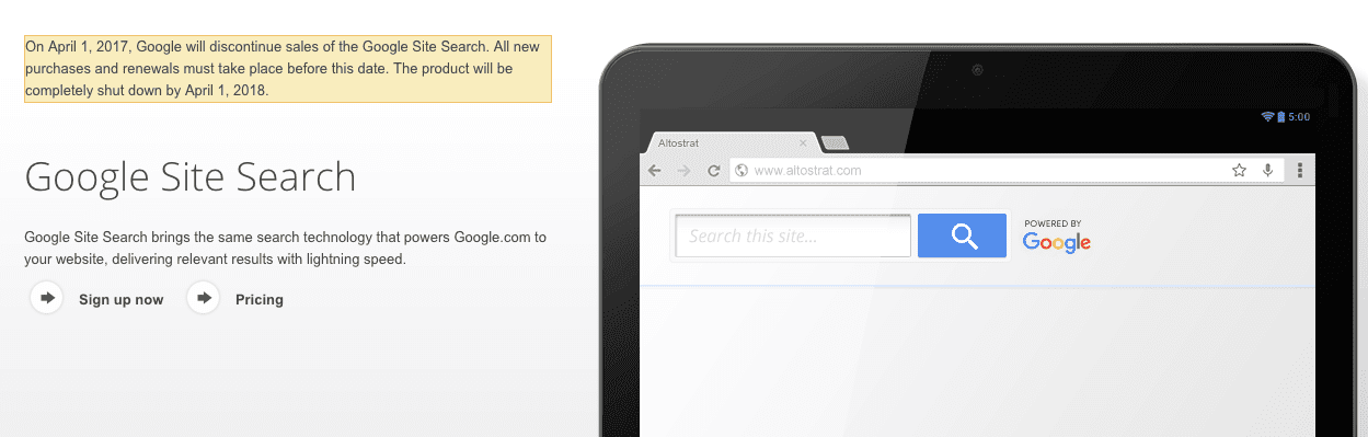 Google will stop accepting new customers for Google Site Search at the start of April, and will turn the product off completely in 2018