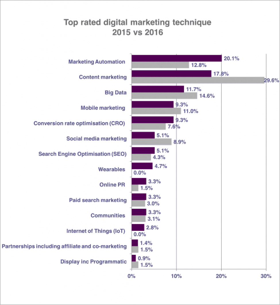 Content marketing was predicted to be 2016’s second best rated digital marketing technique at 17.8%. Although it was ranked much higher the previous year at 29.6%, it nonetheless proves that content marketing has proven to be a solid tactic to help raise your website performance.