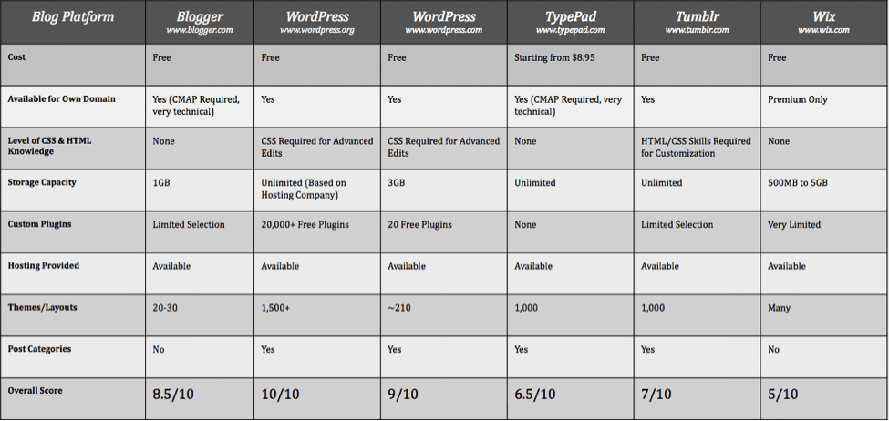 Above is a comparison chart of blogging and CMS platforms to choose from for building your website. Below each column is a score based on different criteria to help you determine the best platform for you.