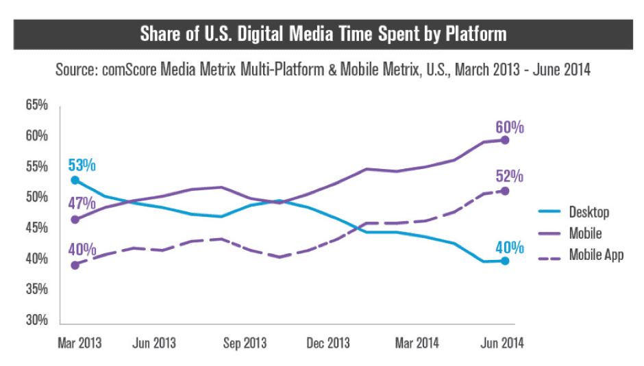 And, more recent research shows a steady increase of mobile devices: 60% of users now prefer tablets and smartphones, while 40% prefer desktop. Apps today are driving the majority of media consumption activity, now accounting for 7 out of 8 minutes of media consumption on mobile devices.